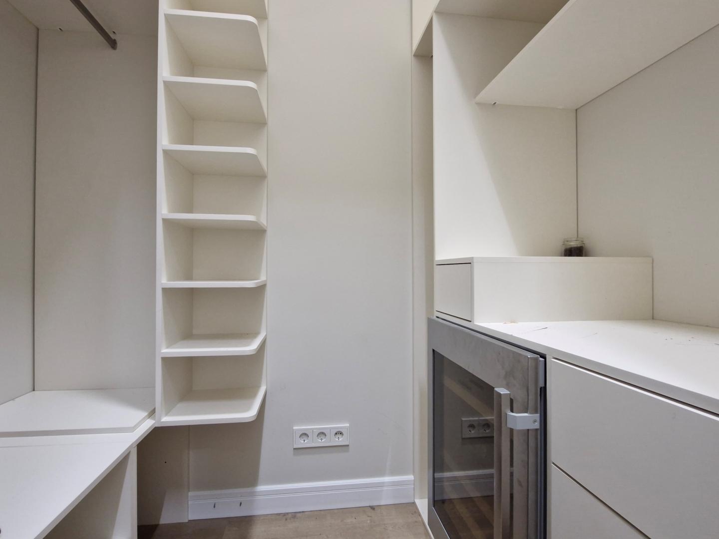 В спальне расположена уютная двуспальная кровать с мягким изголовьем и подъемным механизмом, позволяющим использовать место под ней в качестве дополнительной зоны хранения. Два вместительных открытых гардероба с системой хранения.