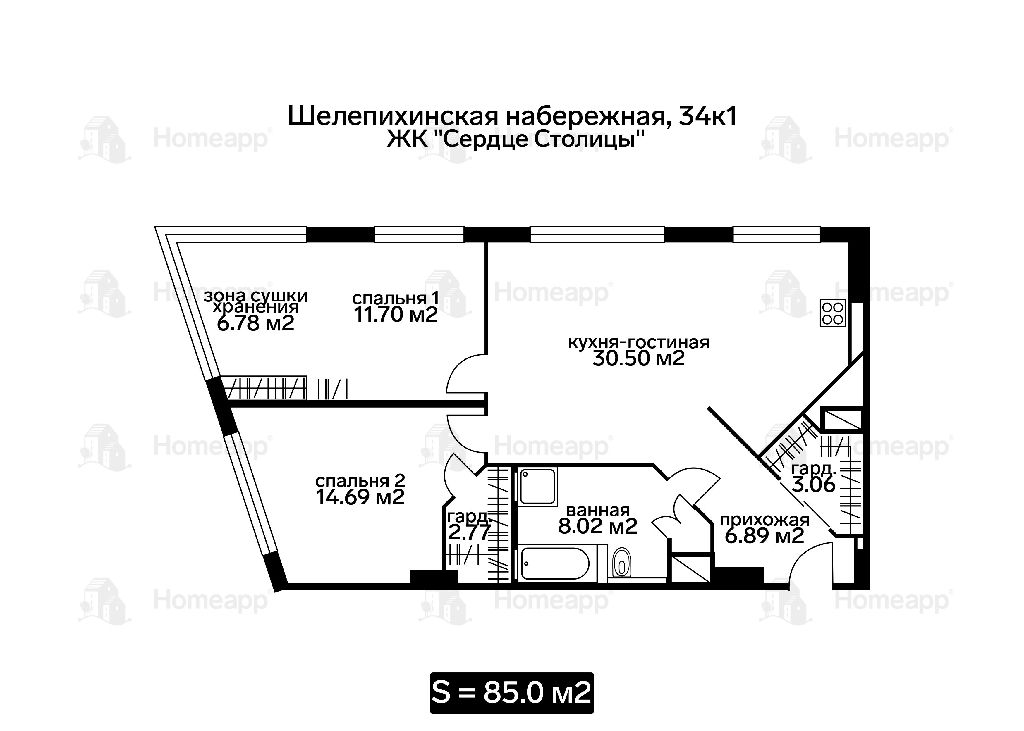 Планировка: просторная кухня-гостиная с обеденной зоной 30,5 м2, мастер-спальня 11,7 м2 с зоной сушки и хранения вещей со стеклянными раздвижными дверями и угловым остеклением 6,78 м2, вторая спальня 14,69 м2 с собственной гардеробной 2,77 м2, ванная комната 8,02 м2 с душевой и ванной, прихожая 6,89 м2 с гардеробной 3 м2.